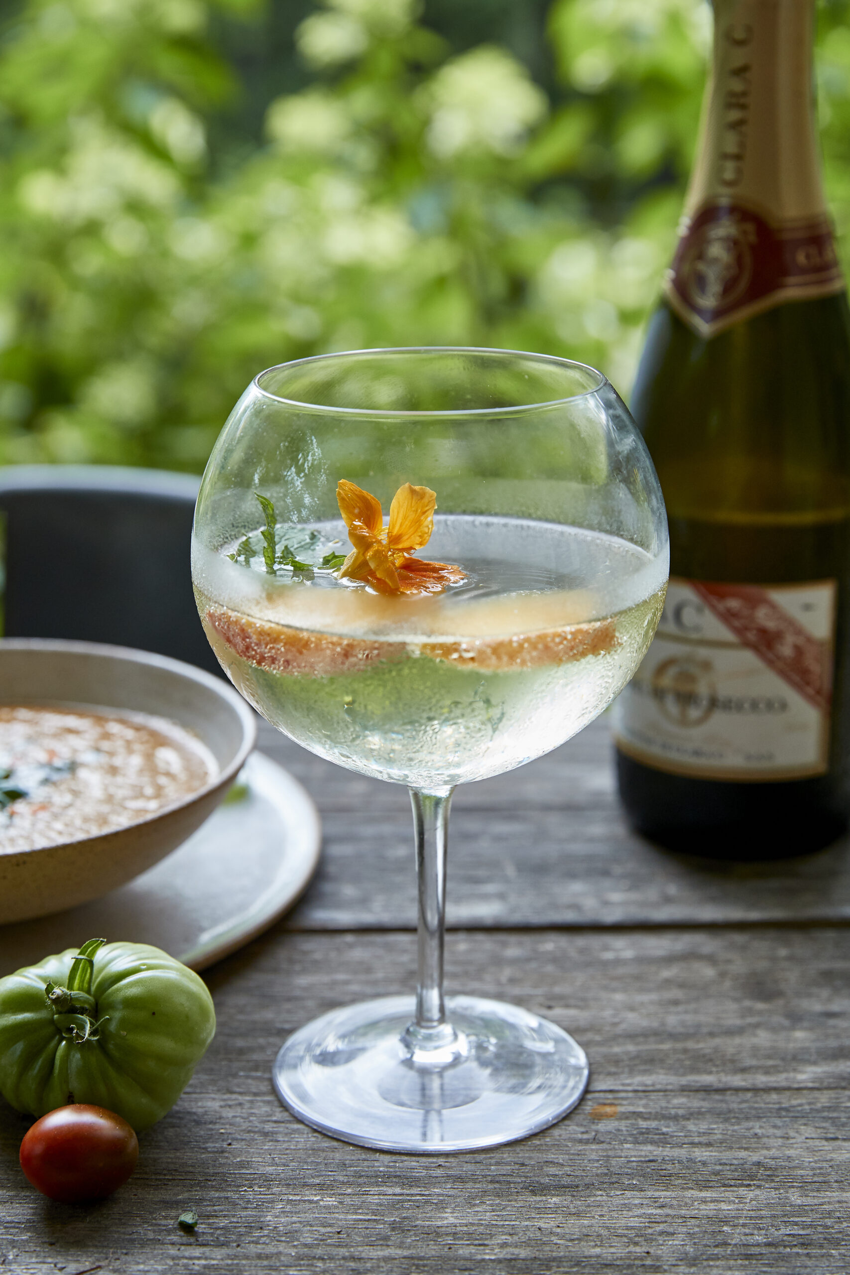 This drink feels like an instant garden party. Best served on a balmy summer afternoon, this Prosecco is made all the better with fresh, seasonal fruit and edible flowers.