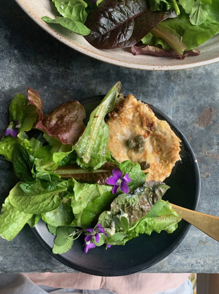 …and sprinkled them over a spring mix with my Nonno’s salata dressing. We served it with leftover chicken piccata: