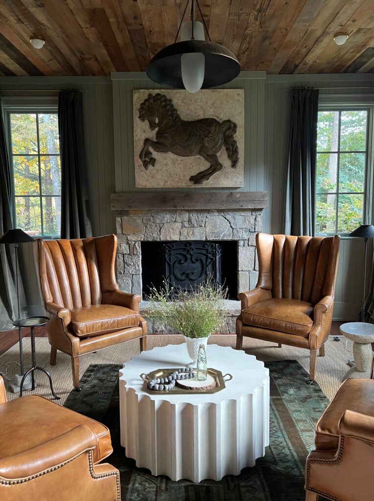 Four philosopher’s chairs (in belmont- dark amber leather) from my collection with Taylor King anchor the space and create one of my favorite go-to furniture arrangements for more intimate spaces. Mike and Tara already have a large family room off of their kitchen so here we had the chance to create a cozy, smaller space for fires and long conversations. (I’ve asked if the room’s gotten any use yet and it sounds like Mike works/ takes calls in there some afternoons and there are Christmas tree plans on the horizon.) There’s nothing like a four-chair room.